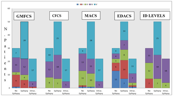 Distribution of patients according to the Manual Ability Classification System [MACS], Gross Motor Function Classification System (GMFCS), Eating and Drinking Ability Classification System (EDACS), Communication Function Classification System (CFCS), and Intellectual Disability (ID) levels [6].