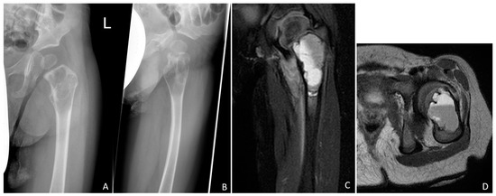 Conventional radiographs of the left hip joint showing the septated cystic lesion of the proximal femur extending immediately to the growth plate in two planes (A,B). Perforation of the thinned cortical bone is indicated in the lateral image (B). The magnetic resonance image clearly shows the multichambered fluid-filled cyst, which is confined to the proximal femur (C,D). In the axial section, the fluid levels are clearly visible (D).