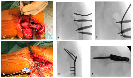 In the otherwise healthy patient, after a biopsy and an intraoperative frozen section investigation, a one-step surgical treatment was performed by subsequent curettage of the cyst (Figure 2A–C), irrigation with polidocanol, filling with allogen cancellous bone, and subsequent osteosynthesis using a locking proximal femoral plate (OrthoPediatrics PediLoc) and transphyseal locking screws (OrthoPediatrics Corp., Warsaw, IN, USA; Figure 2D–F).