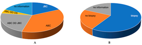 To the question about entity estimation, 18 clinics responded. On the basis of the provided native radiological images and MRI scan, a suspicion of ABC (36.4%) was predominantly expressed, and a differential diagnosis of juvenile bone cyst (JBC; 22.7%) or telangiectatic osteosarcoma (OS; 4.5%) was also mentioned. The sole suspected diagnosis of a juvenile bone cyst (JBC) was expressed by 18% of the hospitals (Figure 4A).