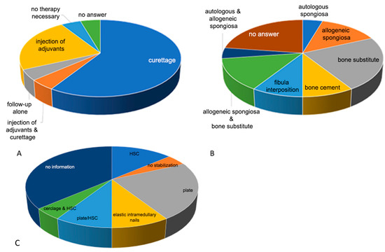 (A) As local therapy, the following were recommended by the respondents: curettage, 68.2%; adjuvant injection and curettage, 4.5%; follow-up alone, 4.5%; injection of adjuvants, 22.7%; no therapy necessary, 4.5%; and no information, 4.5%. (B) For defect filling, autologous spongiosa was recommended by 4.5% of the respondents; allogeneic spongiosa, by 13.6%; bone substitute, by 27.3%; bone cement, by 9%; fibula interposition, by 9%; allogeneic spongiosa and bone substitute, by 13.6%; and autologous and allogeneic spongiosa, by 4.5%. Of the respondents, 22.7% gave no answer. (C) For osteosynthesis/stabilisation, most of the 22 hospitals recommended surgical stabilisation (40.9%), 9% of the clinics preferred immobilisation with an HSC only; 9% did not commit themselves and recommended a procedure (plate osteosynthesis or HSC as a secondary alternative) depending on the findings and completion of the cyst removal and filling; and 4.5% saw no need for immobilisation or stabilisation. Surgical stabilisation using plate osteosynthesis (27%), elastic intramedullary nails (9%), or cerclage and additional HSC immobilisation were mentioned. Of the participating hospitals, 36.4% did not provide any information on this question.