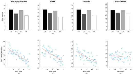 Birth quartile percentage distributions (a–d) and a scatterplot of birthdate frequency by week (e–h) presented individually for all playing positions, backs, forwards, and scrum-halves. The red line represents the best fit of the Poisson regression.