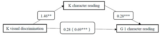 Mediation model of kindergarten visual discrimination, kindergarten character reading, and Grade 1 character reading. Note. The total effect © is between brackets, outside the brackets are the direct effects (c’). K represents kindergarten and G 1 represents Grade 1. ** p < 0.01, *** p < 0.001.