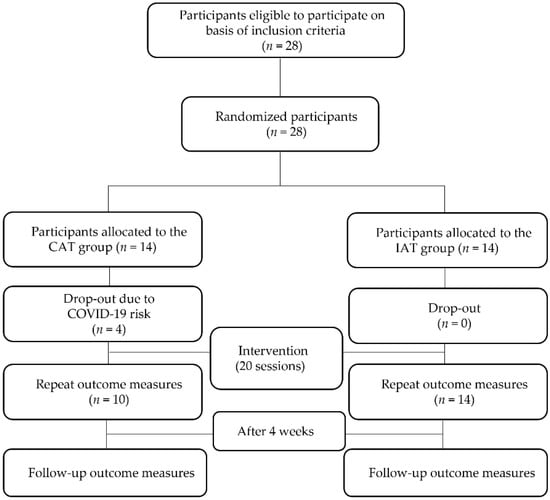 A randomized, single-blind, experimental design was used in the present study. Twenty-eight participants were randomly assigned to either the CAT or IAT group via a random number generator in Excel software (Microsoft Corp., Remond, WA, USA). A researcher generated the random allocation sequence, another researcher assigned participants to interventions, and blinded researchers assessed outcome measures. To remove experimental biases associated with the participants’ expectations, experimental information that could affect the participants was masked until the experiment was completed. At the beginning of the study, there were 14 participants in each group; however, 4 participants dropped out of the control group. The underlying reason for this was an end to the intervention under the policy of the control group’s welfare center or a request by the guardian because of the threat of coronavirus disease 2019 (COVID-19). Standardized clinical testing procedures included the physical domain (PBS), sensory domain (sSP), cognitive domain (FIM and CARS), and social integration domain (COPM, sFES, and PedsQL). These measurements were consistently implemented during the pre-tests, post-tests, and follow-up tests. A flowchart of the study is shown in Figure 1.