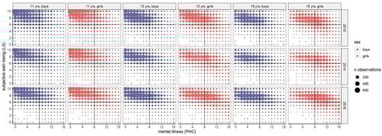 Furthermore, we identified gender and age-specific patterns: girls and older adolescents were more likely to be in the Struggling area (with high PHC) compared to boys and the youngest age group (i.e., 11-year-olds) who were present mainly in the Flourishing condition (with low PHC). Moreover, these patterns seem to increase over time, as shown in Table 1. Globally, the mean subjective well-being (LS) was steady between 2010 and 2018 inside groups. On the other hand, PHC increased in all age and gender groups from 2010 to 2018: especially among girls, the average PHC escalated from 5.3 to 6.4 at 11 years old, from 6.6 to 8.2 at 13 years old, and from 7.5 to 9.1 at 15 years old.