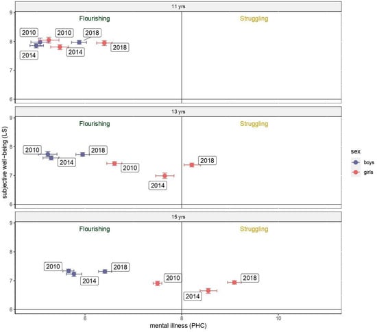 Figure 2 reports the temporal trends of gender and age groups into the Dual Factor Model frame in terms of means and 95% confidence intervals. A shift from the Flourishing towards the Struggling area was observed across time among all gender and age groups. In particular, a skip from one to the other region was seen in the 2010–2014 and 2014–2018 time periods, respectively, among 15- and 13-year-old girls. Such a shift was also seen in the observations’ distribution over time (Figure 1). Furthermore, among 13- and 15-year-old girls, a shift was also reported between the two bottom areas with low LS: from the Languishing (with low PHC) towards the Floundering (with high PHC) condition.
