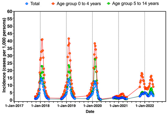 Since the winter season of 2000, the epidemiological and virological surveillance plan for ILI (i.e., InfluNet) has implemented the publication of weekly reports during the “influenza season” (i.e., week 42 to week 17 of the subsequent calendar year) [4,22,23,24,48], and correspondent estimates are freely available on the portal of the Italian National Institute of Health dedicated to the Integrated Influenza Surveillance System (https://w3.iss.it/site/rmi/influnet/Default.aspx; accessed on 19 October 2022). According to the European Center for Disease Prevention and Control’s (ECDC) case definition of ILI [49], InfluNet epidemiological surveillance includes cases characterized by: abrupt onset of fever (>38°), one or more respiratory symptoms (non-productive cough, sore throat, rhinitis), and one or more systemic symptoms (myalgia, headache and severe malaise). In infants and children (i.e., age group 0–4 years, and 5–4 years, respectively), manifestations of ILI also include: abrupt onset of high fever, coryza, cough, sore throat, vomiting and/or diarrhea (particularly in breastfeeding infants), abdominal pain, fatigue, headache, red eye, conjunctivitis, and myalgia [22,23,24,50,51]. From the available weekly reports, we retrieved weekly incidence rates for ILI for the total population, and by age groups: 0–4, 5–14,. All of the data were reported at the national level.
