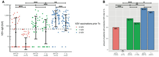 Figure 1. (A) VZV-specific antibodies before and 1 year after paediatric liver transplantation, depending on number of VZV vaccinations prior to transplantation. The y-axis is scaled logarithmically. Data is shown as mean ± standard deviation. The dashed line marks the threshold for serological protection. All groups show a decrease in mean titre after transplantation, regardless of the number of vaccine doses. However, as the bar plots in (B) show, patients with protective VZV antibodies after 1 vaccination are more than 60%, and after 2 vaccinations, more than 85% are still serologically protected. Significant data is marked as follows: * <0.05, ** <0.01, *** <0.001.