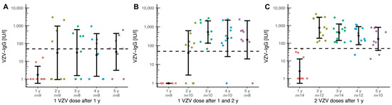 Figure 2. VZV-specific antibody responses following VZV-vaccination in VZV-naïve paediatric liver transplant recipients immunized for the first time 1 year after transplantation. Titre levels over 4 years, following (A) one dose after 1 year, (B) one dose after 1 and 2 years, and (C) two doses after 1 year. The y-axis is scaled logarithmically. Data is shown as mean ± standard deviation. The dashed line marks the threshold of serological protective titres.