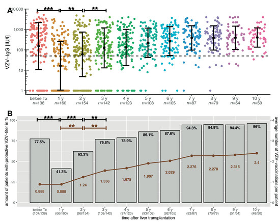 Figure 3. (A) VZV-specific antibody course in paediatric liver transplant recipients over ten years after transplantation. The y-axis is scaled logarithmically. Data is shown as mean ± standard deviation. The dashed line marks the threshold for serological protection. The titre dropped significantly up to the first annual check but increased over the next few years with the possibility of vaccination, even if this increase was only significant at the second and third annual check. This also affected the numbers of patients with protective VZV titres, as shown in the bar plots in (B). The brown graph shows the average number of VZV vaccinations per patient. This was stable from the seventh annual check-up on, when around 95% of all patients were serologically protected, which required an average of 2.3 vaccinations per patient. Significant data is marked as follows: ** <0.01, *** <0.001.