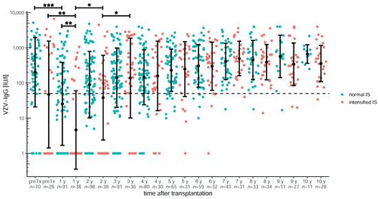 Figure 4. VZV-specific antibody course in paediatric liver transplant recipients over ten years after transplantation dependent on normal (monotherapy with ciclosporin A or tacrolimus) or intensified (monotherapy supplemented by prednisolone or mycophenolate mofetil) immunosuppression (IS). At the first annual follow-up after transplantation, the titres dropped significantly in both groups, and children with intensified immunosuppression also had a significantly lower titre compared with those with normal immunosuppression. At the second annual check-up, titres increased again and did not show any further difference. The y-axis is scaled logarithmically. Data is shown as mean ± standard deviation. The dashed line marks the threshold for serological protection. Significant data is marked as follows: * <0.05, ** <0.01, *** <0.001.