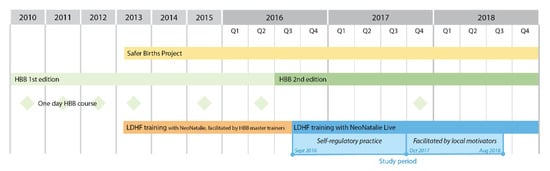Simulation-based training at Haydom Lutheran Hospital 2010–2018. HBB; Helping Babies Breathe, LDHF; low-dose high frequency training. “Local motivators” were dedicated midwives tasked to facilitate and motivate for on-site LDHF training, following the HBB Second Edition.