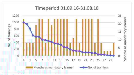 Descriptive data of training frequency for each midwife and duration of time classified as mandatory learner. The X-axis shows the individual midwives participating in the study, numbered from 1–30. The left Y-axis shows the number of trainings per midwife during their period as mandatory learner, illustrated by the blue frequency line. The midwifes are sorted according to this frequency.