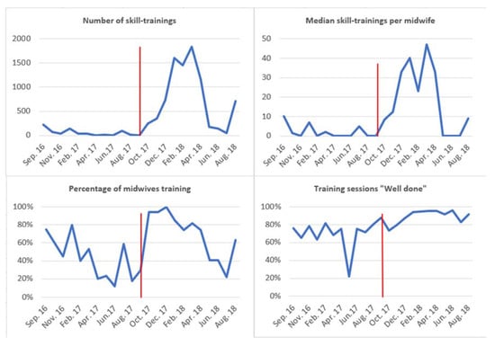 The total number of skill-trainings increased from 688 during the 12 months with an operative mannequin before October 2017 to 8451 during the 11 months after the introduction of motivators in October 2017. There was a steep incline in number of skill-trainings from November 2017, with a marked decline in April 2018. The percentage of midwives conducting self-regulated trainings increased to almost 100% after introduction of local motivators, remained above 80% until April 2018, and decreased to 20% in July 2018. After November 2017, more than 90% of trainings were classified as “well-done”. All indicators appear to increase in August 2018 following a dip in July 2018.