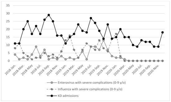 Comparison of KD Admission Numbers, Severe Enterovirus Case Numbers, and Severe Influenza Case Numbers.