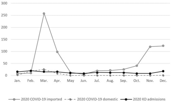 Taiwan had a total of 799 confirmed cases of COVID-19 from January 2020 to December 2020, 743 of which were imported; the remaining 56 cases were the result of domestic transmission. Only five children aged nine years or younger with COVID-19 were reported within this period, although data from the CDC did not specify whether they were imported or domestic [13]. We then compared the number of KD admissions and the number of imported and domestic COVID-19 cases within this period, and found that the number of KD admissions was positively correlated with the number of domestic COVID-19 cases (Spearman correlation coefficient = 0.824, p-value = 0.001, Figure 3 and Supplementary Figure S1), but was not associated with the number of imported cases. This means that during 2020, KD admission numbers moved in the same direction as domestic COVID-19 numbers. In other words, we found that in 2020 lower KD admission numbers were correlated with lower domestic COVID-19 numbers, possibly reflecting decreased infectious disease transmission during this period due to the adoption of NPIs.