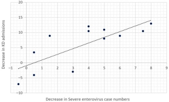Correlation Between the Decrease in KD Admissions and Severe Enterovirus Numbers in 2020.