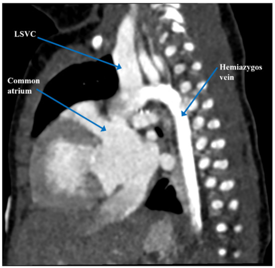 Pre-operative computerized tomography demonstrating hemiazygos vein draining into left SVC and subsequently into the left and anterior aspect of common atrium. LSVC = left superior vena cava.