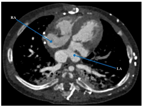Post-operative computerized tomography demonstrating septation between the left and right atrium. LA = left atrium; RA = right atrium.
