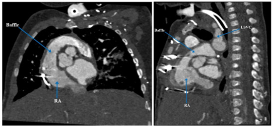 Post-operative computerized tomography coronal and sagittal views demonstrating baffle connection to the right atrium. LSVC = left superior vena cava; RA = right atrium.