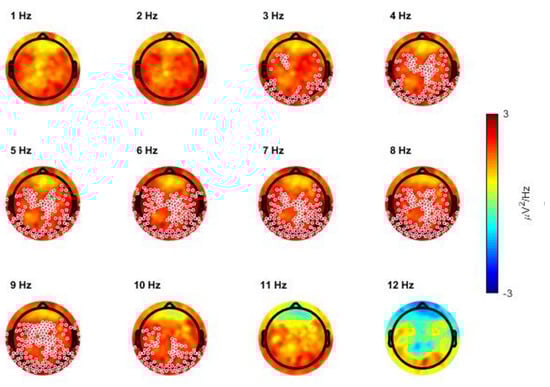 Each map represents the comparison for one bin of frequency centered on the value indicated above each map. Values are color-coded and plotted on the planar projection of the hemispheric scalp model. A lower EEG power in patients with ADHD relative to healthy controls (ADHDs < controls) is represented in blue, a higher power (ADHD > controls) in red. White circles indicate significant electrodes (p < 0.05 cluster-size correction).