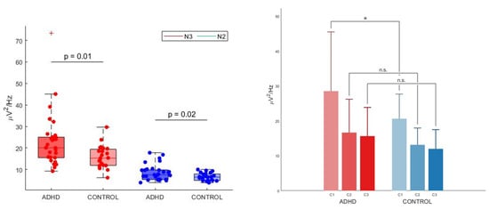 Left panel—Absolute spectral density averaged across channels within the significant Theta cluster in the attention-deficit/hyperactivity disorder (ADHD) and the control group in non-rapid eye movement (NREM) sleep stage 3 (N3) and NREM sleep stage 2 (N2). Red dots represent N3, blue dots N2. The bottom and top of each boxplot are the 25th and 75th percentiles of the sample, respectively. The distance between the bottom and top of each box is the interquartile range. The green line in the middle of each box is the sample median. The whiskers extending above and below each box go from the end of the interquartile range to the furthest observation within the whisker length. Observations beyond the whisker length (more than 3 times the interquartile range away from the bottom or top of the box) are marked as outliers. The cross (+) represents an outlier. The mean difference was significant between the ADHD group (N3: M = 22.90, SD = 12.65, N2: M = 8.60, SD = 3.73) and the control group (N3: M = 15.77, SD = 5.22, N2: M = 6.54, SD = 1.81) for both N3 (p < 0.05, also after the removal of the outlier in the ADHD group, Cohen’s d = 0.70, meaning a medium effect size, independent samples t-test) and in N2 (p = 0.018, Cohen’s d = 0.68, meaning a medium effect size, independent samples t-test). There was a significant interaction effect (p < 0.05) between stages (N3 versus N2) and groups (ADHD versus control) at a mixed between-within ANOVA model (not shown in the figure). Right panel—Absolute spectral density averaged across channels within the significant Theta cluster in the attention-deficit/hyperactivity disorder (ADHD) and the control group in different sleep cycles (first, second and third cycle). X-axes: time expressed in cycles, Y-axes: average power values in selected frequency range of 3–10 Hz, expressed in µV/Hz2. Red bars: ADHD group. Blue bars: control group. C1: first cycle, C2: second cycle; C3: third cycle. There was a significant difference in 3–10 Hz power of the significant cluster of channels for the ADHD group (M = 28.55, SD = 16.97) and the control group (M = 20.63, SD = 7.06) in N3 of the first sleep cycle: t(51) = 2.10, ADHD > controls, p < 0.05, Cohen’s d = 0.61, meaning a medium effect size, independent-samples t-test, two tailed). n.s.: not significant. (*): significant comparison.