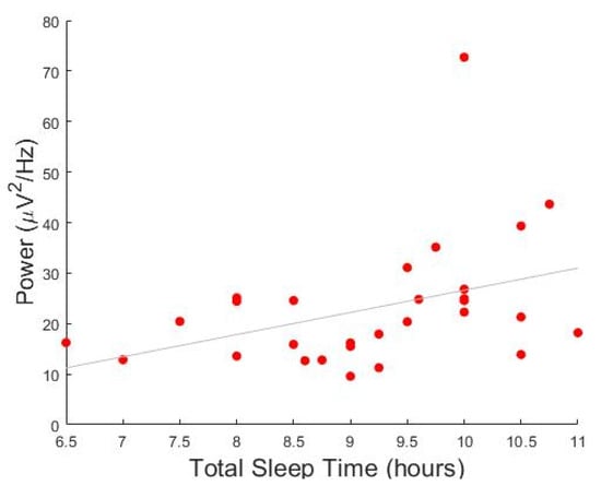 Correlation between power and total sleep time in children with attention deficit/hyperactivity disorder (ADHD). Y-axis represents the average power of all significant channels in the 3–10 Hz cluster. X-axis represents the habitual total sleep time estimated by parents.