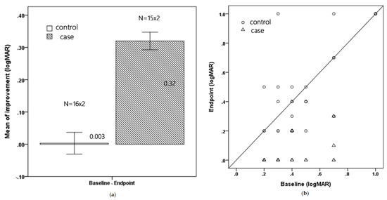 At the endpoint visit, subjects in the study group showed a significantly greater improvement in BCVA, with a mean of 0.32 ± 0.15 logMAR (3 lines improvement) versus 0.003 ± 0.19 logMAR (nearly no improvement) (p < 0.001). The average treatment duration was 5.7 months (range, 3–12 months) for the case group and 6.19 months (range 3–12 months) for the control group. Figure 1a shows the mean improvement for both groups and Figure 1b shows the change in each patient.