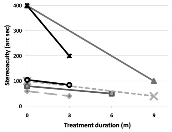 Subjects in the study group suffered no adverse events, such as new tropia or diplopia, during the treatment period. There was no decline or further improvement in vision 3 months after the cessation of treatment.