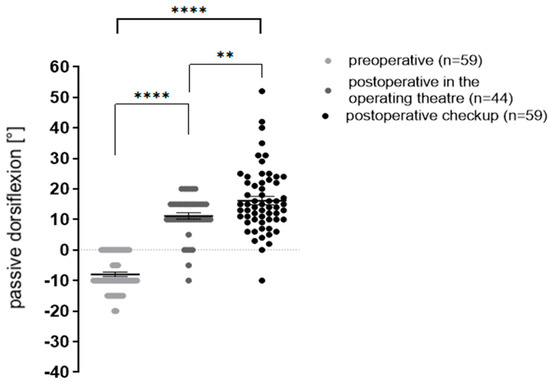 Figure 3. Dorsiflexion before, directly after surgery and at follow-up (** p < 0.007; **** p < 0.0001).