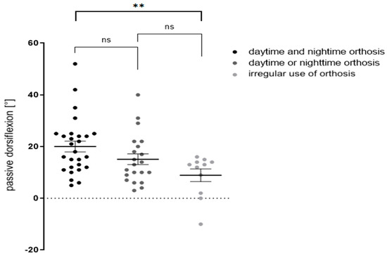 Figure 4. Impact of regular use of orthotic devices on passive ankle dorsiflexion at follow-up (** p < 0.05).