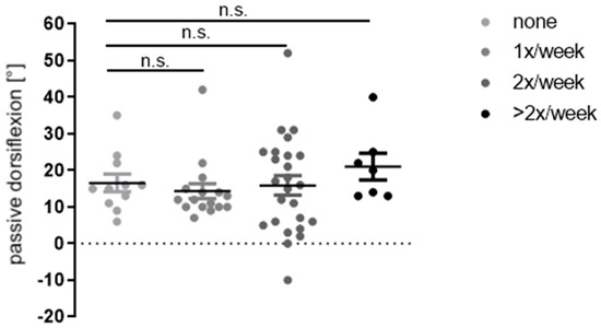 The administration and frequency of physiotherapy was analyzed as another confounding factor on ankle dorsiflexion. Out of the 59 operated feet, n = 11 feet (18.6%) did not receive physiotherapy after surgery, n = 41 (69.5%) received physiotherapy once or twice a week, and n = 7 (11.9%) two times or more. At follow-up, the average values of dorsiflexion did not show significant differences (16.6° vs. 14.3° vs. 15.9° vs. 21°) (Figure 5).