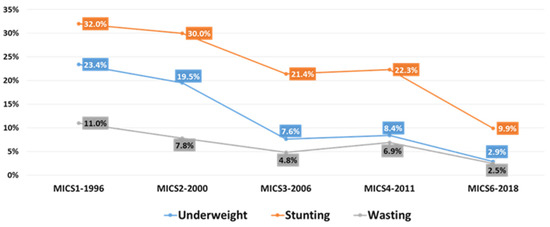 The Multi-Indicator Cluster Survey (MICS1; 1996) revealed the prevalence of wasting equivalent to 11%, while stunting was at an average of 32% [21].