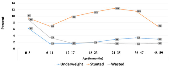 Looking at this figure, wasting is found to be highest at zero to five months, and stunting between the ages of 24–30 months. (Figure 3 below) [17].