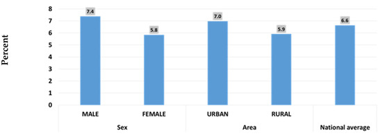 Regarding childhood overweight in CUF (Figure 5 below), MICS6 2018 reveals that the national average is 6.6%, higher in males and in the urban residents, while Figure 6 reveals that overweight is highest around the age of 12 months [17].