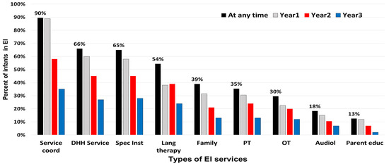 At the time of this study, children in Ohio who were DHH were eligible to receive specialized EI services that followed the SKI-HI Curriculum [17], which uses family-centered programming for infants and young children who are DHH. Services were provided through a regionalized program, with 9 separate regions across the state supporting 88 counties. EI services were identified within a child’s IFSP and were provided primarily in the home. The components of the service type that made up specialized DHH services are illustrated in Table A1. In addition to the DHH Service type, children also received service types based on individual needs. Such services could include (but are not limited to) occupational therapy, physical therapy, speech-language therapy, audiological services, and service coordination. Because of the numerous different types of services a child could receive, we determine a priori to focus on a set of services found most frequently within the IFSP of children who were DHH. These EI services included service coordination, specialized DHH services, special instruction, speech–language, family training and counseling, physical therapy, occupational therapy, audiologic services, and parent education. These services also had the highest cumulative hours of service assigned for our target population of children who were DHH.