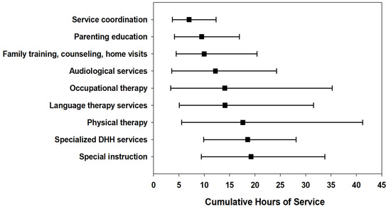 Median cumulative hours of early intervention service for the duration of early intervention, by common service types among children who are deaf or hard of hearing. Error bars represent the 25th and 75th percentiles.