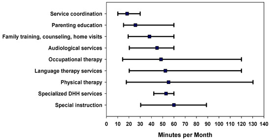 This work extends our knowledge about EI for children who are DHH beyond the age of enrollment to include an understanding of EI service intensity. Our study findings are consistent with previous studies on EI intensity; DHH children received a little over 2 h per month with substantial variability in intensity; 10% of children received at least 2 h per week. Previous literature has stated that children enrolled in EI receive a range of service intensity from approximately 2 h per week [18] to 2–3 h per month [19,20,21]. Wiggen et al. [12] reported that children who were DHH received on average 3–4 intervention sessions per month ranging from 30–90 min, with the majority of sessions lasting 60 min each. Intervention sessions were not necessarily limited to Part C EI and included sessions that occurred within intervention centers. For children who are DHH, early interventions are designed to minimize or prevent delays and promote language development. Thus, our EI cohort differed from other studies in that EI eligibility was based on identified hearing loss, irrespective of any developmental disabilities or delays that may have been present.