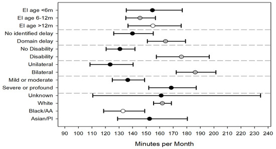 Adjusted average intensity (minutes per month) of all common early intervention service types for first enrollment year. Error bars represent 95% confidence intervals. Abbreviations: EI = early intervention, m = months, AA = African American, and PI = Pacific Islander.