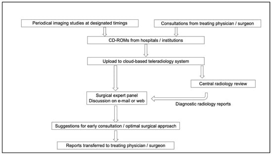 In all studies, radiological evaluation was mandated at designated time points using enhanced computed tomography (CT) or magnetic resonance imaging (MRI). The images were copied onto CD-ROMs and shipped to the study coordinator. The study coordinator uploaded them to a cloud-based teleradiology system (Esite Healthcare Co. Ltd., Tokyo, Japan). Each panelist was provided with login accounts to view the full images on their computer terminals or other personal devices accessible to the Internet (Figure 1).