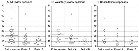 Duration of the first surgical review sessions in the studied 35 cases. “Entire session” indicates the number of days from the imaging study to the completion of the report. Period A indicates the number of days from the imaging study to the beginning of the reviewing process, and period B indicates the period from the beginning of the reviewing process to the issue of review report. (A) Duration of all review sessions included; (B) Duration of voluntary review sessions; (C) Duration of sessions in response to consultations from participating centers.