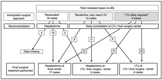Of the 19 cases recommended to be treated with conventional partial hepatectomy, in addition to the two cases in which surgical data were missing, all 17 patients underwent hepatectomy either at the original institution or at a referring institution (Figure 3). Of the ten cases categorized into “borderline,” eight ultimately received hepatectomy either at the original institution or a transplant center, whereas two underwent transplantation. Of the six patients who were likely to require transplantation at the surgical review, four were ultimately treated with LTx, whereas two underwent hepatectomy.