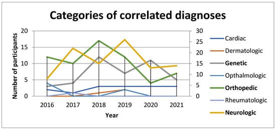 Canavese (2020) [5] stated that there is a lack of quality evidence to prepare clinical practice guidelines. The purpose of this study was to highlight the importance of physiotherapy outcomes in a variety of correlations between DDH and other diagnoses. No other studies have investigated the prevalence and associations of DDH within the practice of pediatric rehabilitation. Worldwide, physiotherapists and occupational therapists significantly contribute to DDH treatment not only in post-surgery cases but also in conservative treatment. Many patients are diagnosed with DDH later in life, with no or a very late rehabilitation intervention.