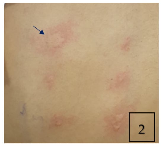 A complete blood count (CBC) showed elevated white blood cells (WBC) of (17.4 × 109/L) with high eosinophils (4.8 × 109/L). A C-reactive protein and erythrocyte sedimentation rate (ESR) were slightly elevated at 30 mg/L and 34 mm/h, respectively.