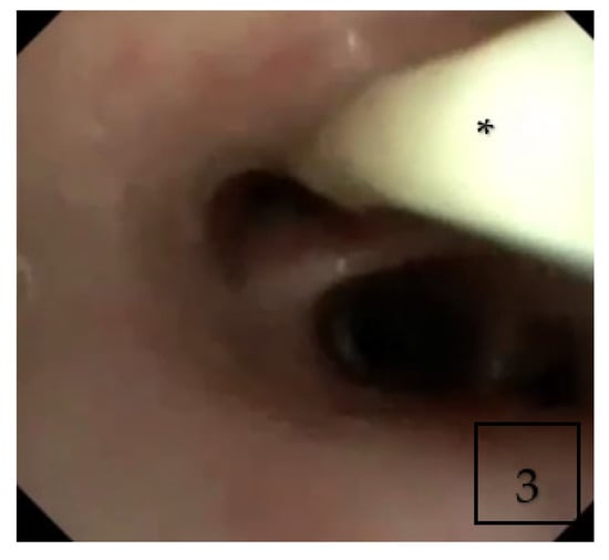 Flexible bronchoscopy showing thick purulent secretions (Asterisk *) in right middle lobe.