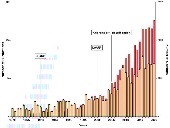 Overall publication and citation performance of ARM research from 1970 to 2020, presented as the total number of publications (orange) and citations (red) per year. Landmarks in the treatment of ARM are indicated. PSARP: posterior sagittal anorectoplasty, LAARP: laparoscopically-assisted endorectal pull-through.