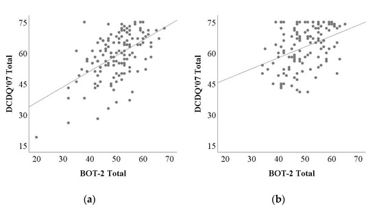 Standardized performance-based tests such as the BOT-2 can objectively measure an individual’s ability with structured administration. In contrast, questionnaires such as the DCDQ’07 can assess a child’s motor skills through the perception of a respondent (e.g., the parents). The respondent can provide meaningful information relevant to daily activities. However, such information might be subjective. Although the parents’ perception of their children’s motor skills measured through the questionnaire was basically related to the children’s actual motor ability evaluated by the performance-based test [24], the strength of such relationship varied across studies [25,26]. Three factors (control during movement, fine motor/handwriting, and general coordination) of the DCDQ’07 were related to all four motor areas (fine motor control, manual coordination, body coordination, and strength and agility) of the BOT-2 in Brazil [27], whereas only the gross motor of the DCDQ-parent, the previous version [28] of the DCDQ’07, was significantly correlated with manual coordination of the BOT-2 in Australia [29]. Such inconsistency between previous findings might be attributed to differences in parents’ perspectives across cultures. The present study examined the relationship between the DCDQ’07 and the BOT-2 to understand how well Korean parents’ perceptions of their children’s motor skills corresponded to their children’s actual motor proficiency.