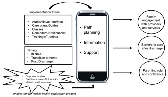 Designing a mobile health application for caregivers of infants hospitalized in the NICU and to support them in the transition of their child from the NICU to home is a novel concept that has not been previously studied. In their randomized control trial of a smartphone application to support parents of premature infants during this transition, Garfield et al. found that, with increased use of their NICU-2-home smartphone app, parents reported increased sense of competence and discharge preparedness [15]. Our study is uniquely positioned to provide a conceptual model for the development of a mobile app tailored to the needs of parents and to the recommendations and expertise of healthcare providers from the NICU. While our results demonstrate that path planning, information and support are all desired areas of content for a mobile app, our findings in terms of parent and provider implementation ideas can also serve as a helpful framework for future app development. Overall, an application developed based on this model could empower families, serve as a credible source of information and be an important source of mental health resources and services. It is also important to consider access to stable data plans and internet when designing products [26].