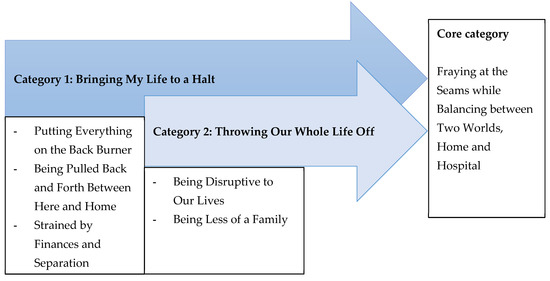 The core category, Fraying at the Seams while Balancing between Two Worlds, Home and Hospital, summarized parents’ reported challenges. This core category depicted the central phenomenon of the grounded theory. The substantive theory of “balancing between two worlds, home and hospital” represented parents’ efforts to respond to the core problem that family and personal daily life were “thrown off” as the parent’s entire existence focused completely on their hospitalized child’s health and survival. Parents reported their family roles and responsibilities often had to be changed, and normal daily activities and routines had “fallen by the wayside”. Parents were overwhelmed, stressed, and felt like their life was falling apart. Two overarching categories and their subcategories were identified that explained the theoretical process. The process is described in Figure 1. Each step is described below with supporting data.