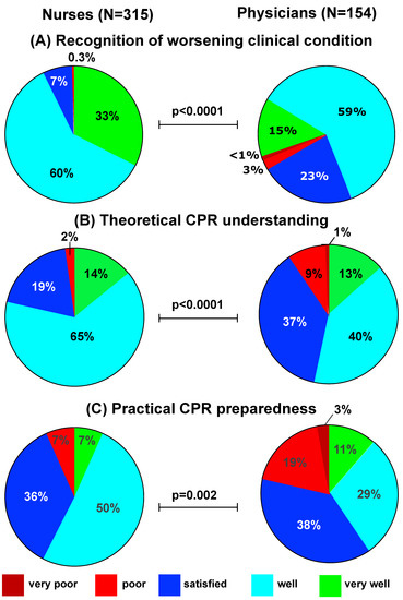Self-perceived readiness to recognize a clinical deterioration and perform cardiopulmonary resuscitation among nurses and physicians. Nurses, significantly more often than physicians, felt well or very well prepared to recognize a worsening clinical condition of a child (A). Similarly, nurses rated their theoretical understanding (B) and practical (C) preparedness to manage a life-threatening situation requiring cardiopulmonary resuscitation (CPR) significantly higher compared to physicians.